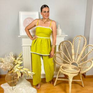 Conjunto de dos piernas en color pistacho. El pantalón tiene engomado en la cintura y dos bolsillos. El top con nido de abeja en la espalda.