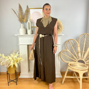 Conjunto de dos piezas en color chocolate. Tiene una abertura en el lateral y emngomado en el top y la falda.